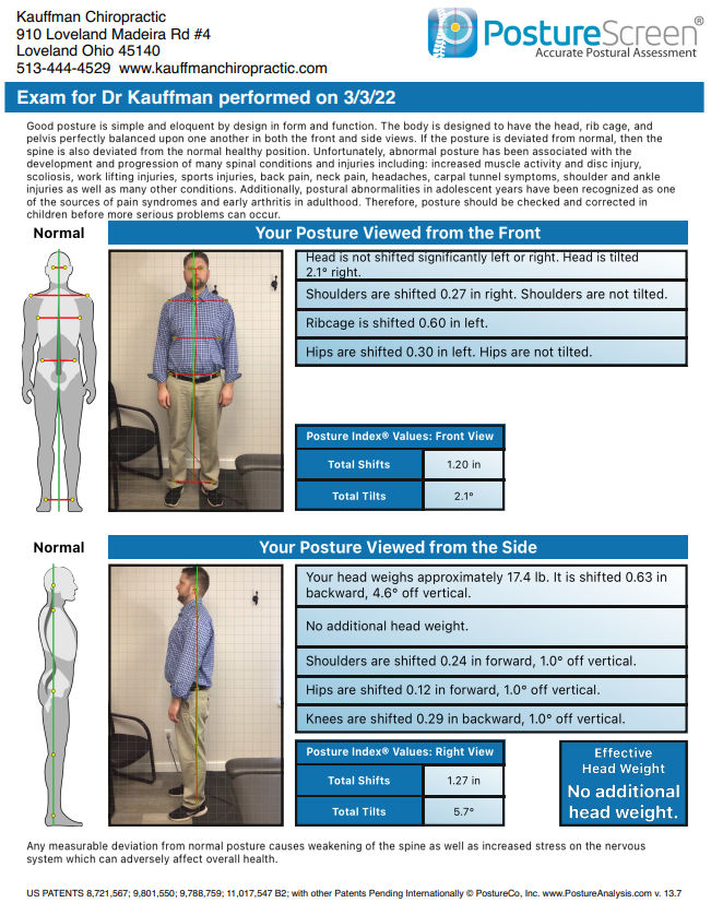Here Dr. Kauffman shows you an example of bad posture. This Posture Screen evaluation demonstrates that he has postural abnormalities. As a result structural deviations could cause him symptoms of pain as well as a myriad of other health problems. Based on physics his head now weighs 66.4 pounds.